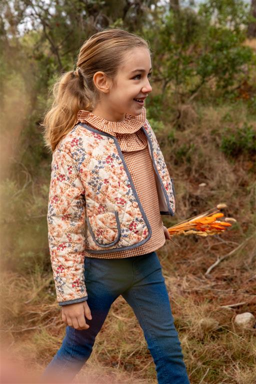 Casaco florido com bolsos à frente. Aperta com molas na frente.