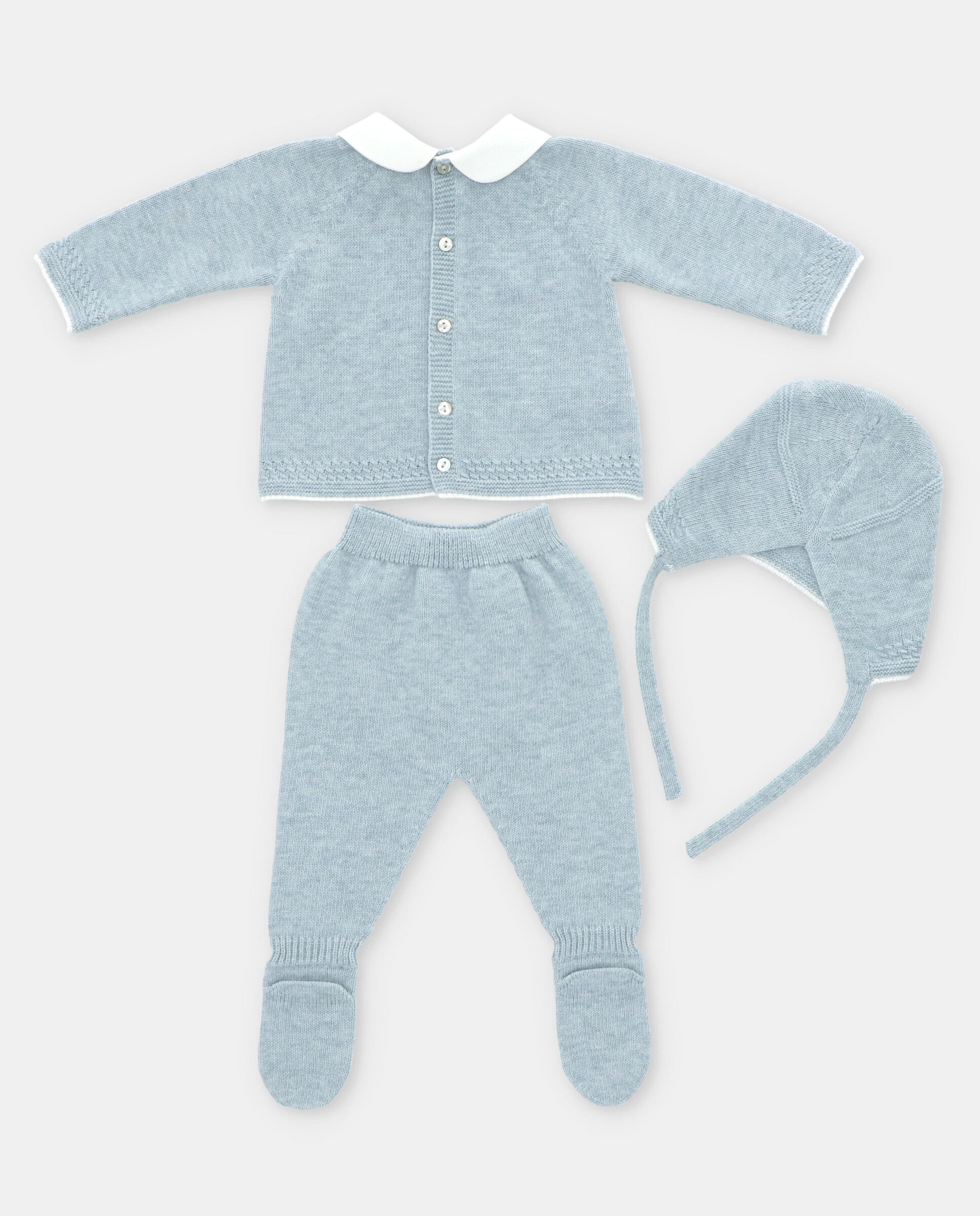 Conjunto de 3 peças, camisola, calça com pé e gorro.