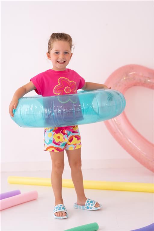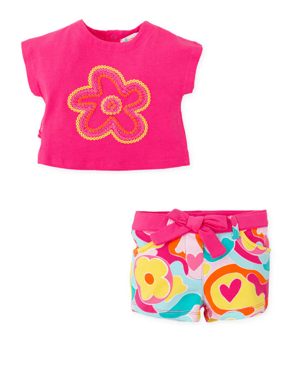 Conjunto de duas peças em malha lisa com elastano, com t-shirt com estampa floral fúcsia e costas com botões de pressão. Calção com estampa fantasia multicolorida e cós elástico ajustável.