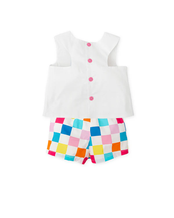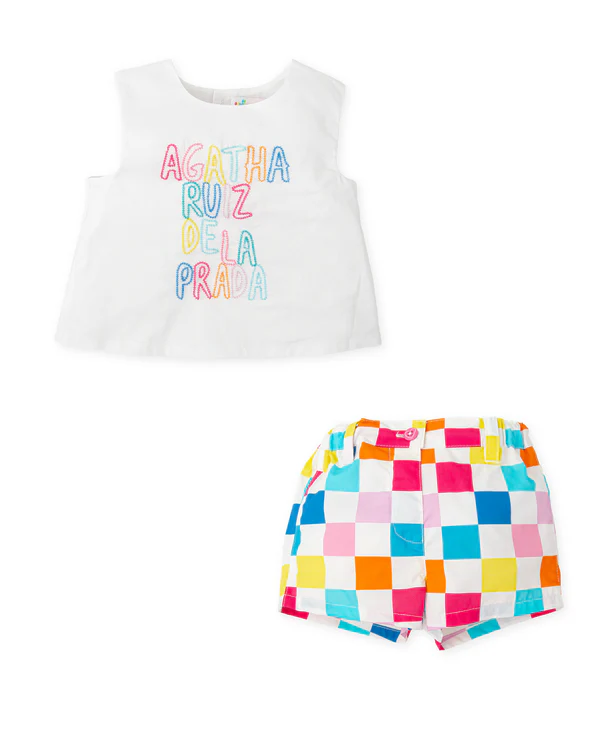 Conjunto de T-shirt e calção, T-shirt branca com bordado do logotipo. Calção de popeline  xadrez multicolorido com cós elástico ajustável.