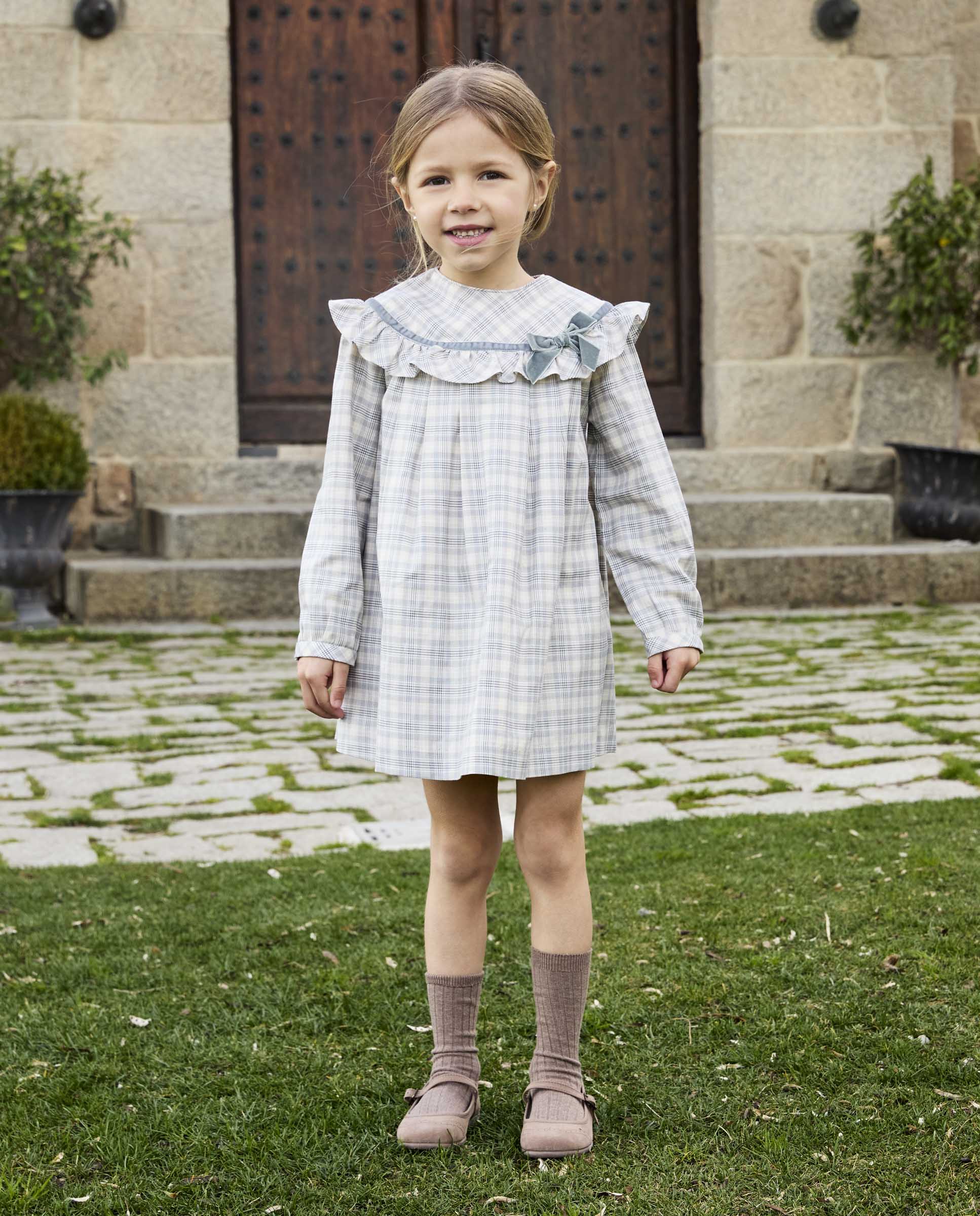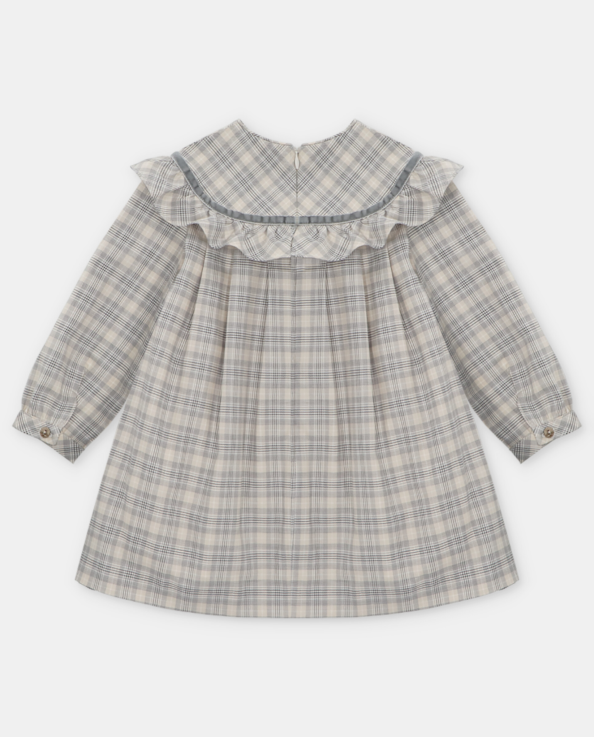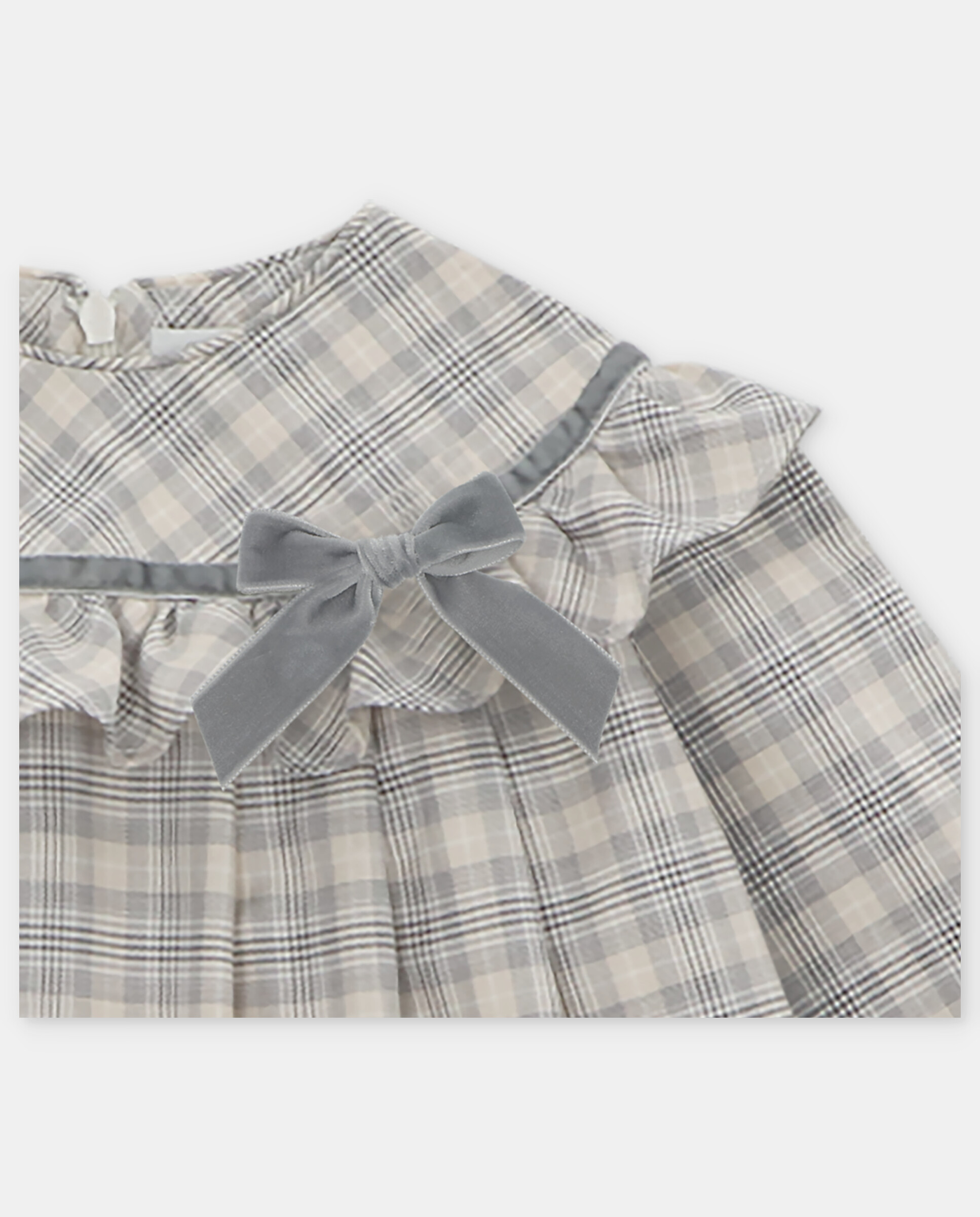 Vestido xadrez, com folho na zona da gola, pormenor de laço em veludo. Abertura com fecho na parte de trás , e botão no punho.