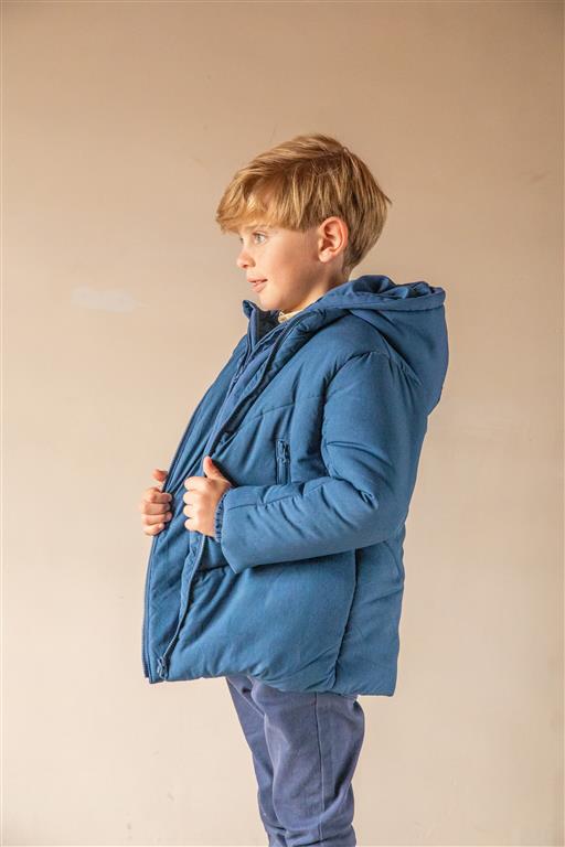 Casaco com capuz e bolsos à frente. Exterior kispo, interior forrado com microfibra. Aperta com 2 fechos dando a sensação de 2 casacos.