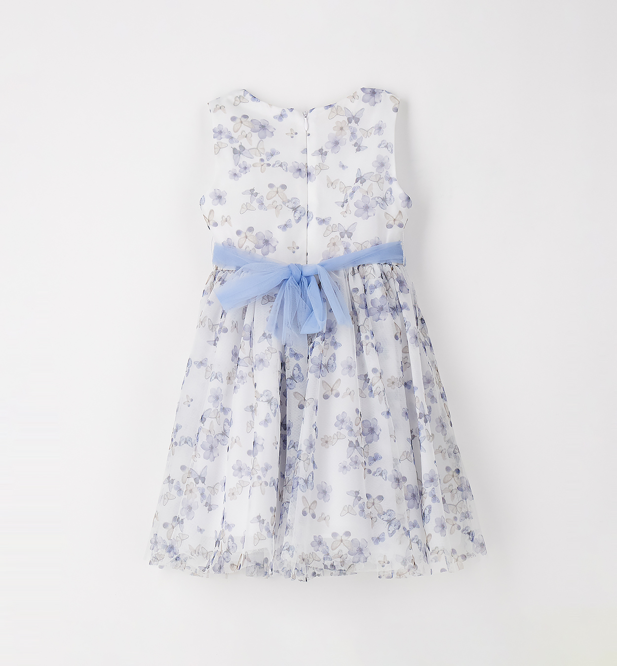 Vestido estampado de borboleta e flores, abertura na costas com fecho.