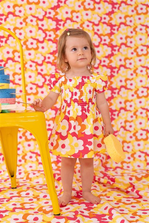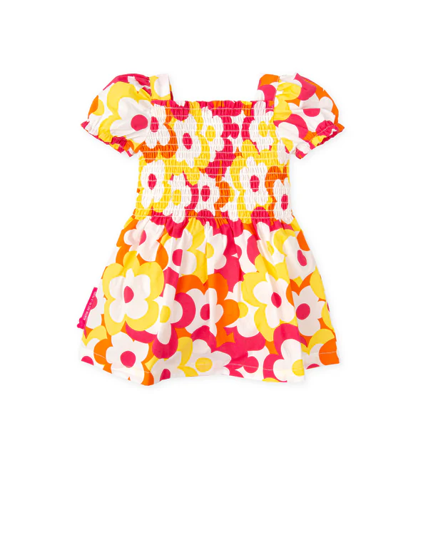 Vestido de popeline de manga curta com estampa floral multicolorida e elástico no peito.